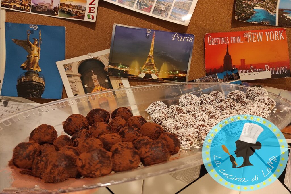 A questo punto, formare tante piccole palline, di dimensioni leggermente più piccole di una noce, e poi passarne metà tra le scaglie di cocco e le restanti nel cacao in polvere amaro.